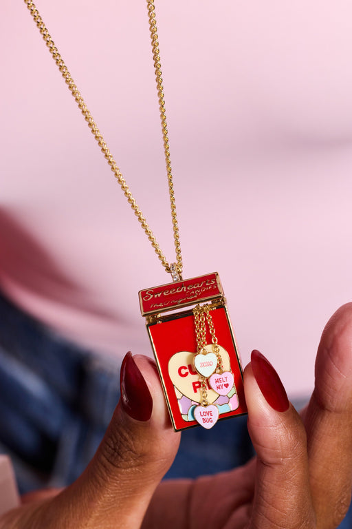 This whimsical pendant features a charming Sweethearts® box adorned with vibrant enamel and printed accents. Pop it open to discover three delicate...
