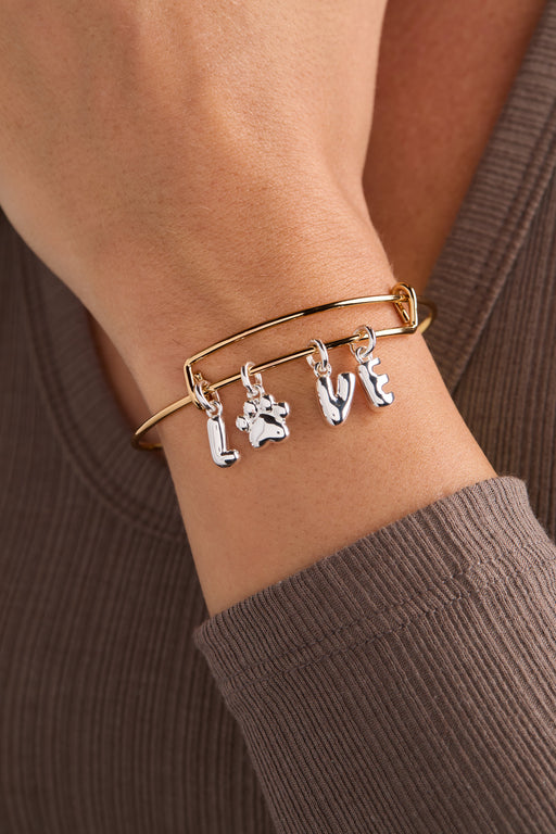 View full detailsCelebrate your furry friend with this Pet Love Multi Charm Bangle. Featuring a striking two-tone design with a gold-plated base and silver puffy le...