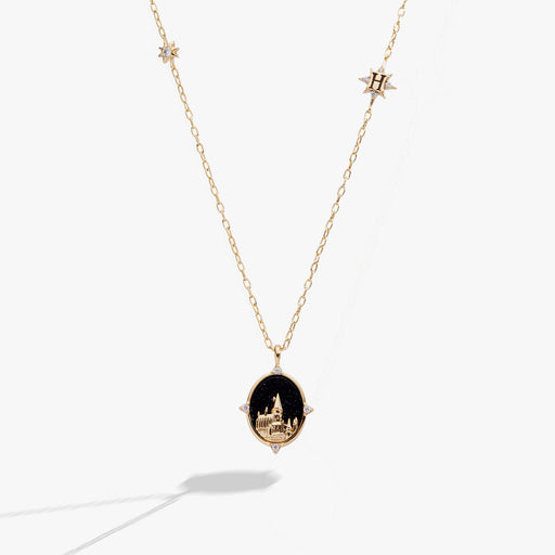 View full detailsEnchant your everyday style with this gold-plated necklace featuring the iconic Hogwarts castle set against a shimmering blue sunstone backdrop. De...