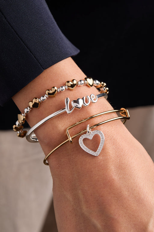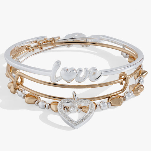 View full detailsOpen your heart when you wear this set of three love bracelets. An adjustable cuff says "Love," while one expandable wire bangle has two-tone heart...