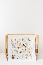 One side of our For the Birds Quilt, you'll find a collection of sweet and playful birds including: Bluejay, Robins, Hummingbird, Cardinals, Strawberry Finch, Goldfinch, Stripe Headed Tanger, and a whole lot more... the other side is a rich and earthy brown.