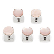 Beautiful creamy pink mother of pearl has been cut into a cushioned disc and surrounded in shiny sterling silver, to create this set of elegant tuxedo studs. Soft-edged square fixed backings keep your studs in place all night long, and this set can be worn alone or paired with our matching cufflinks for a perfect spring or summer formal look. Includes individual gift box.