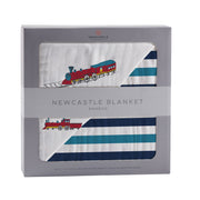 Vintage Steam Trains and Blue Stripe Bamboo Muslin Newcastle Blanket