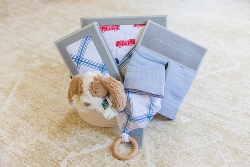 View full detailsWelcome Baby Boy basket includes a 100% cotton Newcastle Blanket, a cozy swaddle, blankie set and soothing teether. The ensemble is completed with...